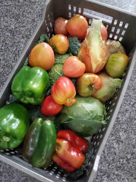 Acabadinho de chegar. Produtos frescos que o Carlos acabou de deixar aqui na loja. Cebolas, lombarda, alho frances, tomate e pimentos. Tudo de agricultura biológica.